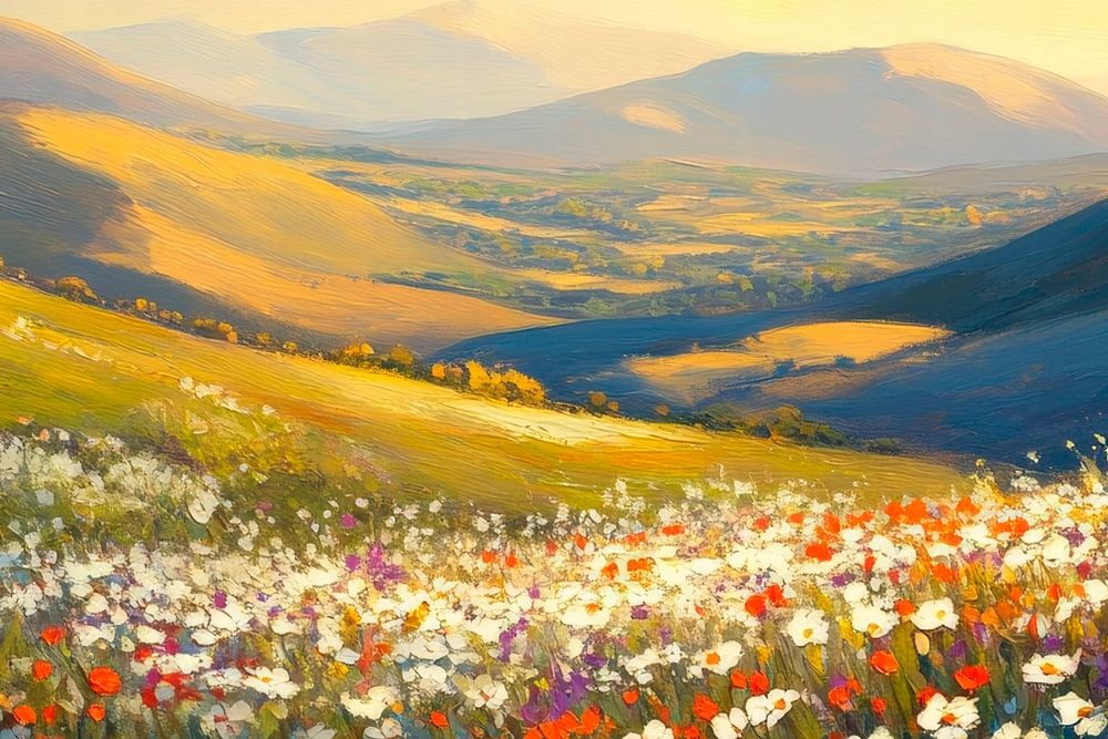 A blooming sea of colour sweeps through rolling hills, while the sun shines gently over the mountains. The bright flowers radiate an inviting cheerfulness and lend any room a feeling of joie de vivre and closeness to nature. Ideal for the living room, this picture creates a harmonious and relaxing atmosphere.
