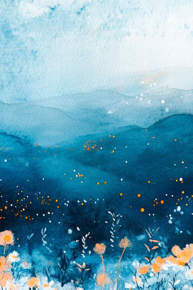 In soft blue and orange tones, the landscape merges with a hint of dream. The bright flowers dance in the gentle breeze, while the rolling hills in the background remain mysteriously blurred. This work of art brings peace and harmony to any bedroom and invites you to travel in your thoughts.