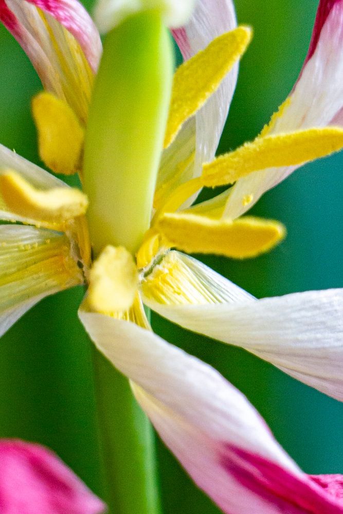 A tulip from The Netherlands. Once it has finished flowering its leaves bend which is special in this picture. The green background makes the tulip stand out beautifully.