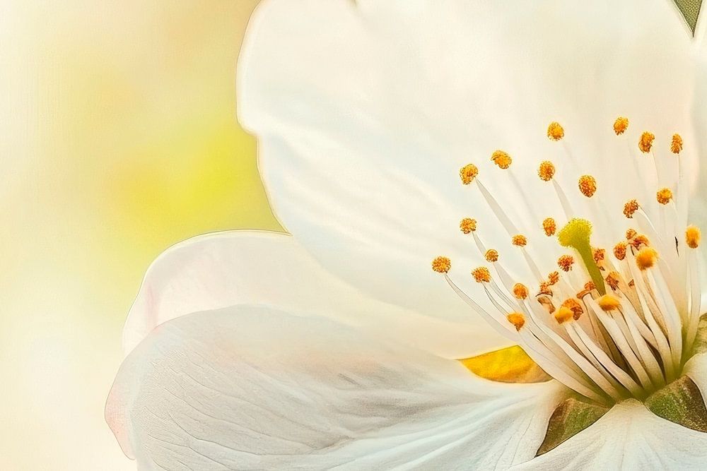 A delicate white flower blooms in soft, bright colours, its delicate petals almost seeming to be kissed by the sun. The fine yellow stamens radiate joie de vivre and lend the picture a fresh note. Ideal for the living room, where it enriches the atmosphere with a touch of nature and lightness.