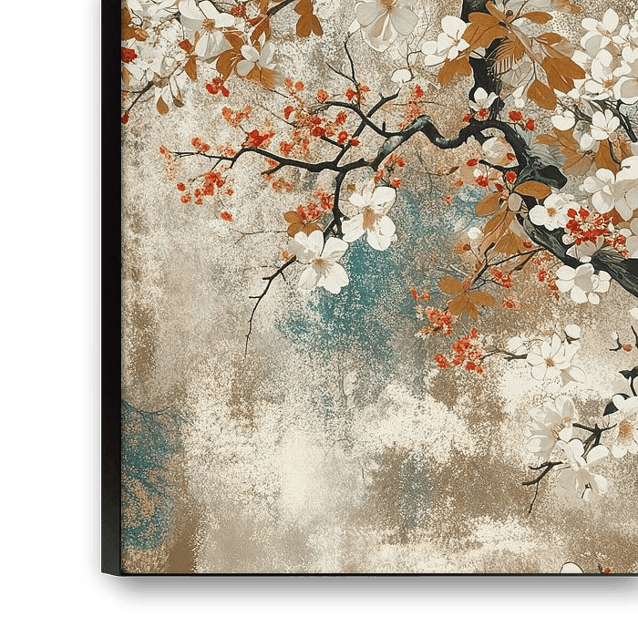 Blossom Artwork - The canvas features a vibrant depiction of nature with a hint of classical Oriental art. Finely detailed branches with a mix of blooming white and warm red blossoms contrast beautifully against a textural background with a sublime balance between earth tones and shades of gold and bronze. The whole exudes timeless elegance and brings an organic, stylish look to any type of interior.