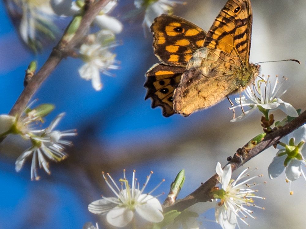 Lovely dreamy photo of an Orange Butterfly in Spring in a tree with white blossom against a bright blue background.