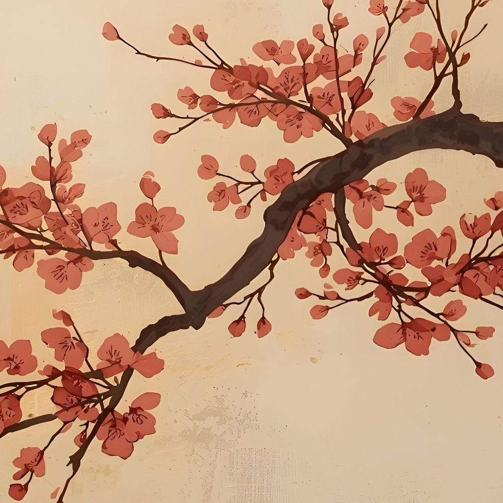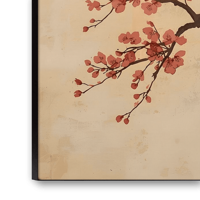 Be enchanted by the serene beauty of this japandi-style painting, on which a graceful branch with blossom comes to life. The subtle shades of light brown, gold and soft pink bring tranquillity and sophistication to any interior. Each brushstroke exudes harmony and elegance. Perfect for those who love natural simplicity with a touch of luxury. Let this work create a moment of stillness and balance in your space.