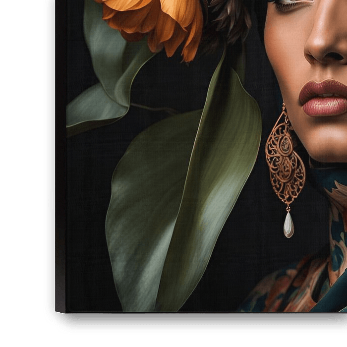 This beautiful portrait of a Muslim woman wearing a flowered headdress is a must-have for any art lover. The use of bold colours, intricate details and a black background makes for a truly captivating piece. The woman's expression is serene and confident, and her flowered headdress is a symbol of her beauty and femininity.