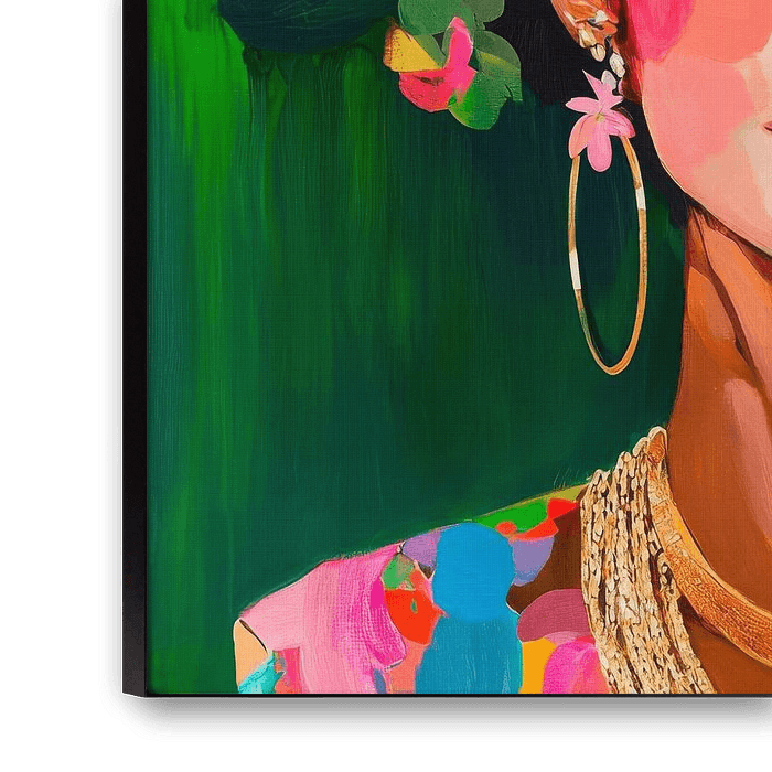 The picture shows a beautiful woman with a lively headdress of large, colourful flowers. Her face radiates calm as she stands gently with her eyes closed. The bright colours of her make-up and the golden earrings are striking, adding extra sparkle to her expression of inner strength and beauty.