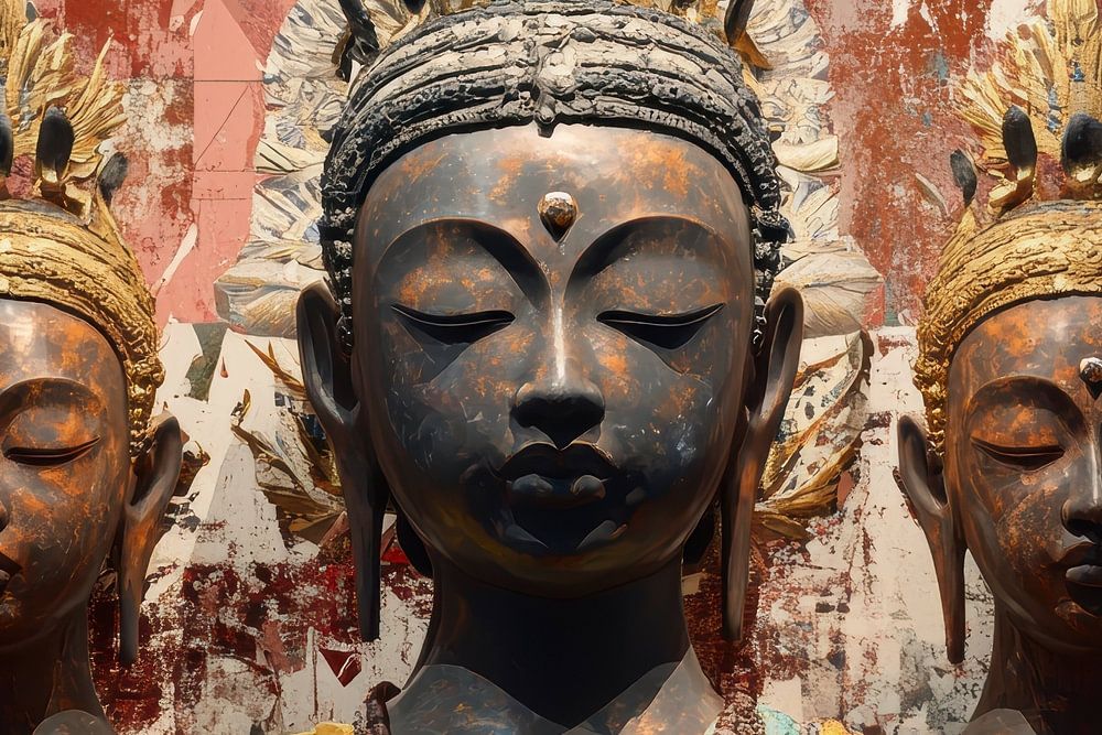 This artwork depicts a stately Buddha in deep shades of blue and gold, with two smaller figures on either side. The composition creates a strong and impressive whole, ideal as a statement piece in a modern or traditional space. The powerful colours combined with the Buddha's serene face exude balance and sophistication. This piece is a perfect choice for anyone looking for art that not only fills the space, but also adds a sense of depth and reflection. Place this artwork in a living room, office or meditation room for a calm and stylish ambiance.