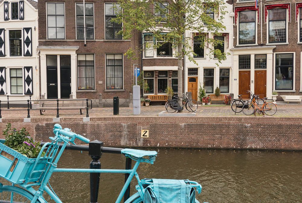 A blue (turquoise) bicycle in the foreground of the Lange Haven in Schiedam.