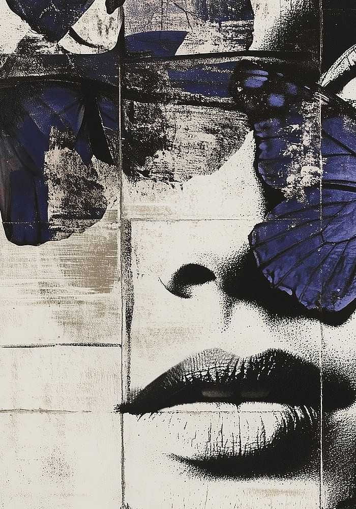 Black-and-white portrait of a beautiful woman surrounded by blue butterflies and blue vertical and a horizontal line. Thin lines run across her face in a grid. Faint grey-brown strips can also be seen. Her face fades on one side into white beige. Penetrating and mysterious eye gaze. Modern Abstract, sober, rural, natural and black and white.