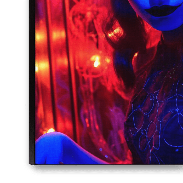 Buy this digital art artwork Blue Demon Girl at the Bad Girls Motel | Photography by Frank Daske | Foto & Design as a reproduction on canvas, ArtFrame, poster and wallpaper, printed on demand in high quality.