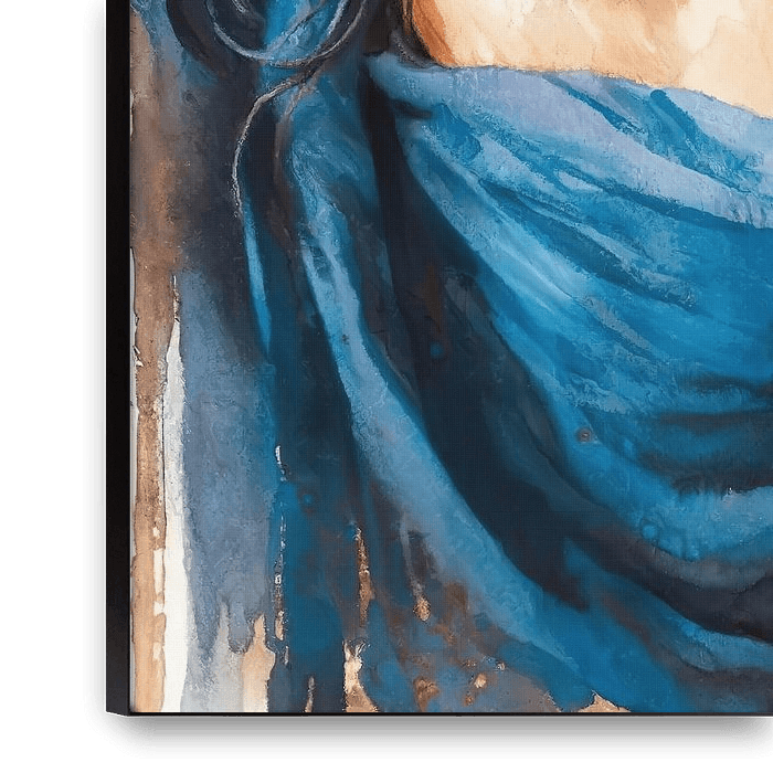 A pair of light blue eyes emerges from a deep blue headscarf, filling the square format with an intense, steady gaze. Layered folds of fabric wrap around brow, nose and chin, painted with soft washes that shift from midnight blue to lighter indigo. Subtle drips run down the edges, leaving traces on the pale background and keeping plenty…