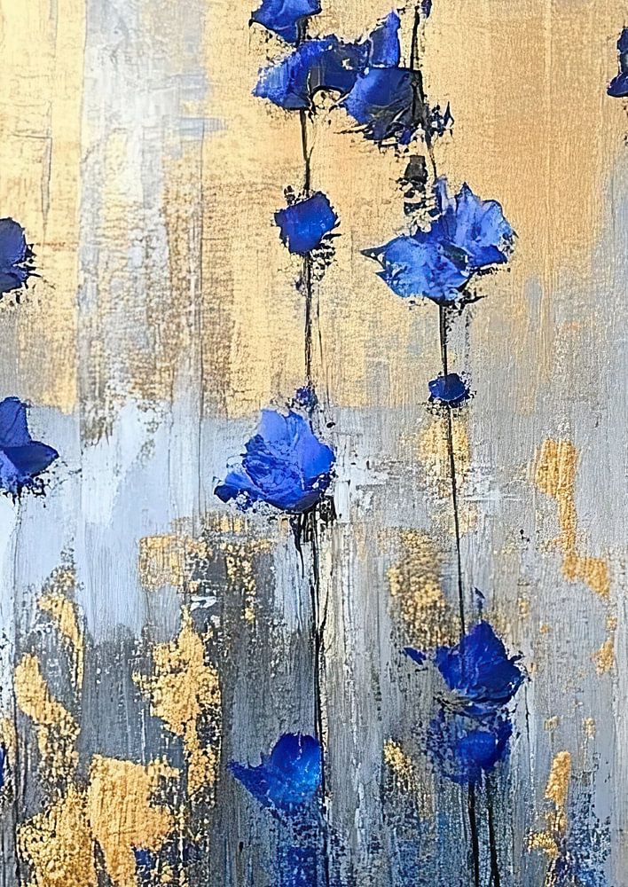 Blue Flowers - This flower painting shows vibrant blue flowers playfully arranged against a background of shiny gold and grey, which give the image an almost three-dimensional sense of depth and texture.