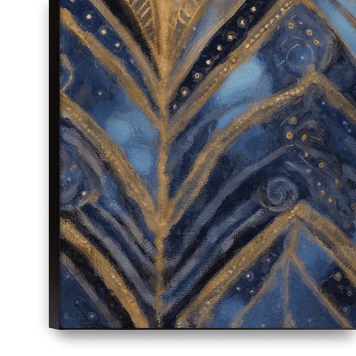 This work shows a detailed pattern of arched segments in different shades of blue and gold. The upper half consists of gold-coloured geometric lines and patterns, while the lower half changes to deep blue tones with spiral details. The arch shapes create a repeating and harmonious whole reminiscent of art deco and art nouveau…