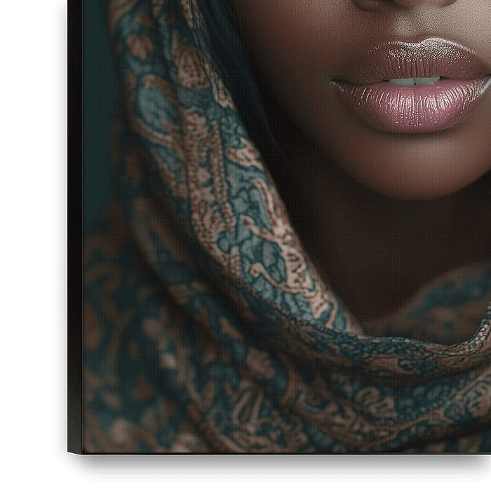 In een wereld van kleur en stilte staat zij, een vrouw van mysterie en elegantie. Haar blik is intens, gefocust, en tegelijkertijd zacht. Haar amandelvormige ogen, als poorten naar een andere wereld, stralen een diepe, innerlijke wijsheid uit, alsof ze de geheimen van de tijd zelf kennen. Ze kijkt recht vooruit, haar blik zowel…