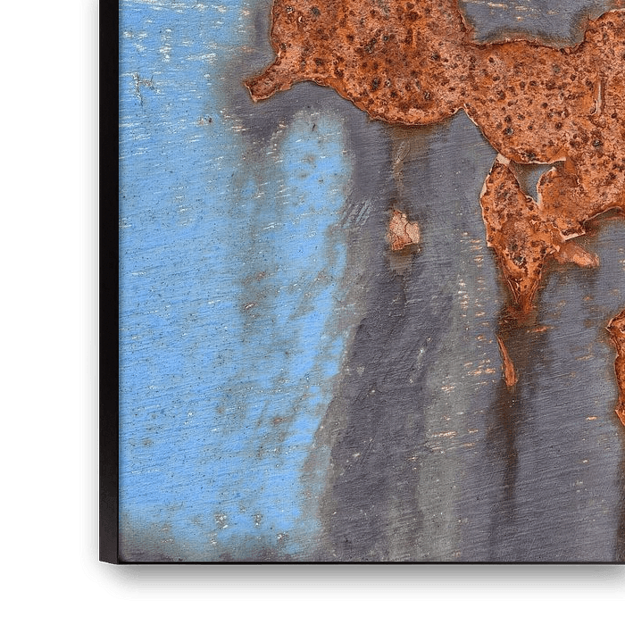 The contrast of the complementary colours between the blue of the paint and the red of the rusty metal surface gives the picture a subtly harmonious appearance. The rusty areas emphasise the industrial charm. Any number of motifs can be interpreted into the randomly created shapes. There are no limits to the viewer's imagination. This textured image is ideal for modern living spaces, lofts, offices or creative studios looking for an urban-industrial look.