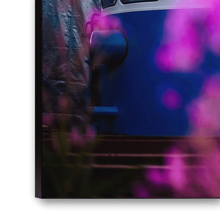 Blue‑white railcar framed by soft pink flower bokeh in warm evening light. Calm, cinematic railway print with a fresh color palette for homes and offices.