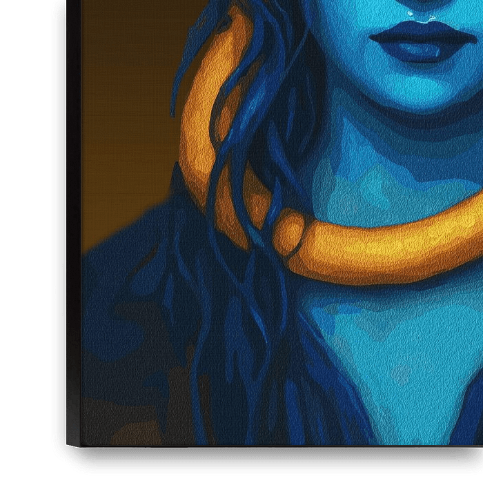 Step into the world of surreal symbolism with this mesmerizing artwork. Featuring a blue-skinned woman crowned with a golden serpent and adorned with a vivid red rose, this piece blends mystery, mythology, and beauty into a single captivating portrait.