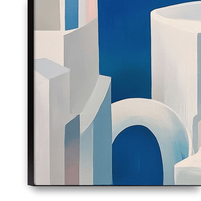 A harmonious interplay of soft blue and white tones draws the viewer into a dreamlike coastal landscape. The geometric shapes of the architectural structures merge with the glittering sea, while delicate flowering accents bring life and colour to the tranquillity of the surroundings. An invitation to dream and discover.