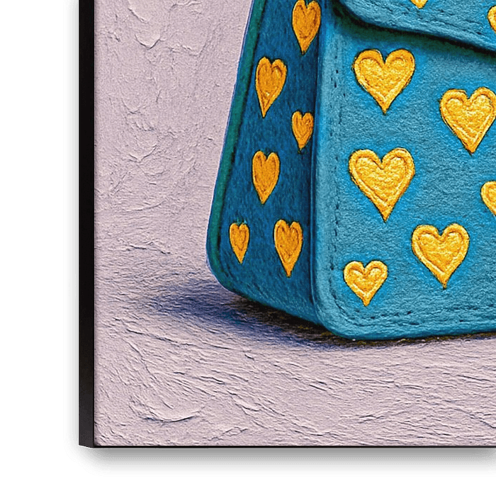 This blue bag full of golden hearts brings joy and luxury together in one image. The beautiful combination of deep blue and shiny gold makes the piece striking and stylish. The soft purple background supports the design without being overpowering, making the bag really stand out.