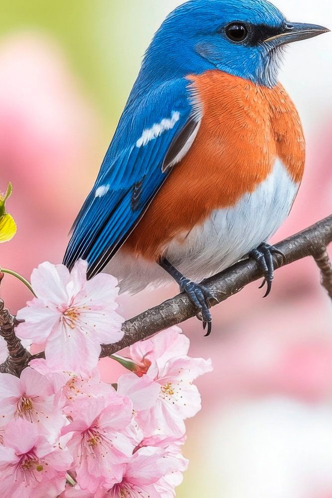 A bright blue bird sits proudly in the midst of delicate cherry blossoms, with a warm orange colour on its chest. Its plumage shines in harmonious contrast to the soft colours of the blossoms, while the spring-like scenery underscores the lightness and beauty of life. A truly enchanting spectacle of nature!