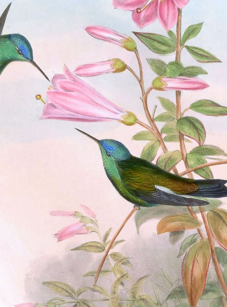 Blue-capped Saucerottia (Saucerottia cyanifrons), John Gould On perusing the pages of the present work, it will be seen that ornithologists have occasionally selected the names of individuals celebrated for their scientific attainments to designate some of the many genera into which they have found it necessary to subdivide this great family of birds. This illustration has been restored to its original vibrancy by enhancing colors and removing unwanted marks. A monograph of the Trochilidæ, or family of humming-birds was published between 1849 and 1887 by English ornithologist John Gould. This monumental work depicts and describes all the known species of hummingbirds at the time - comprising 418 lithographic plates and information on 537 species."
