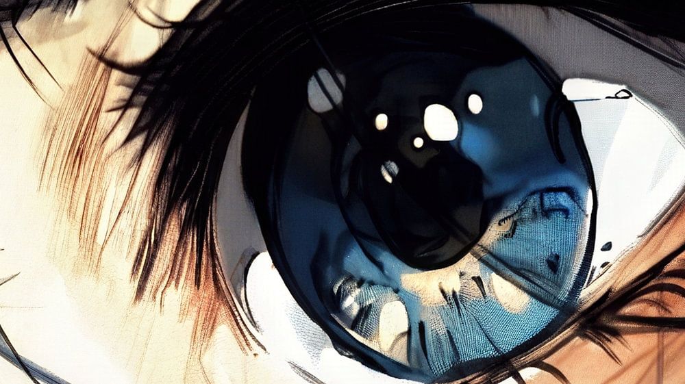 This digital close-up shows a fascinating stylised blue eye that immediately captivates the viewer. The intense reflection of light and shadow creates an impressive depth effect that makes the eye appear vivid and mysterious.