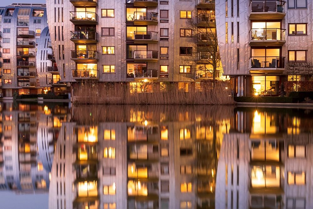 During a quiet evening, we were in De.n Bosch to photograph these machine-like apartment buildings. The reflection and the illuminated apartments give the image something alienating.