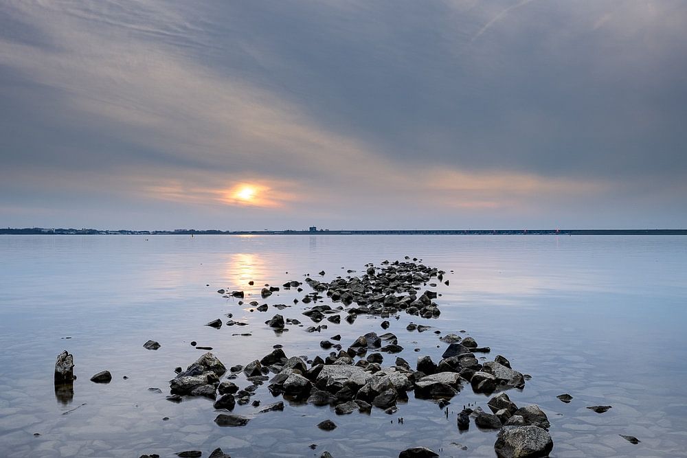 On a large lake during the blue hour, rocks lie exposed in plain view above the waterline during low tide. The setting sun can still shine through clouds with great difficulty.