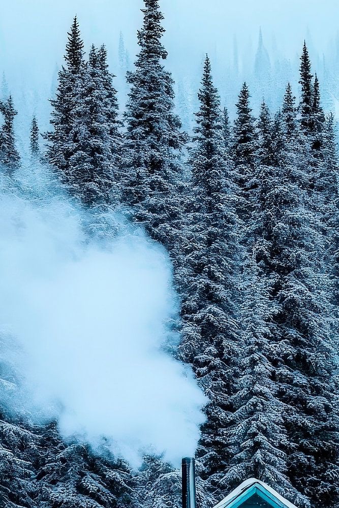 In the heart of a snow-covered winter landscape stands a charming, turquoise-coloured house, from which smoke rises gently into the grey sky. Surrounded by majestic fir trees, the scene radiates peace and security. With its contemplative atmosphere, this picture invites you to linger and dream.
