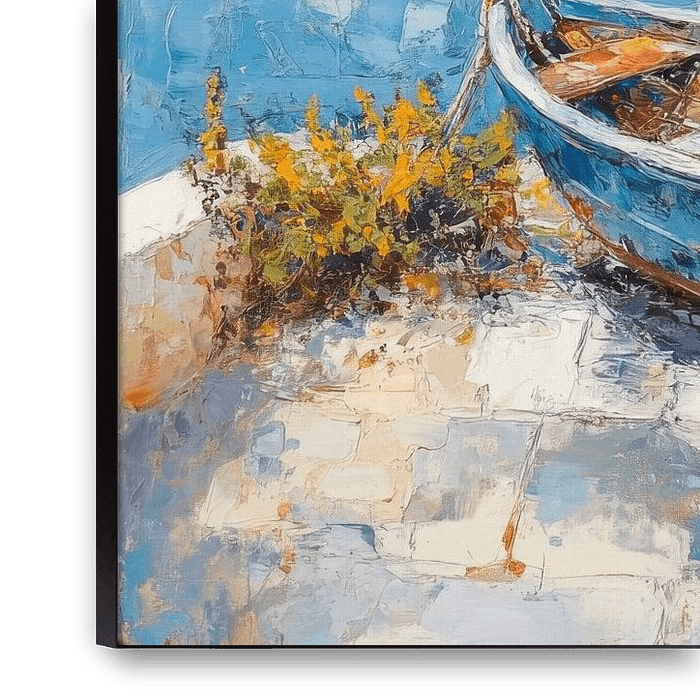 A radiant blue embraces the wooden boat, which lingers gently against a white wall. The Mediterranean atmosphere is awakened by the sunny heat and the view of the vast sea. Doors seem to whisper stories, while the sight of the calm sky invites the soul to wander into the distance and explore dreams.