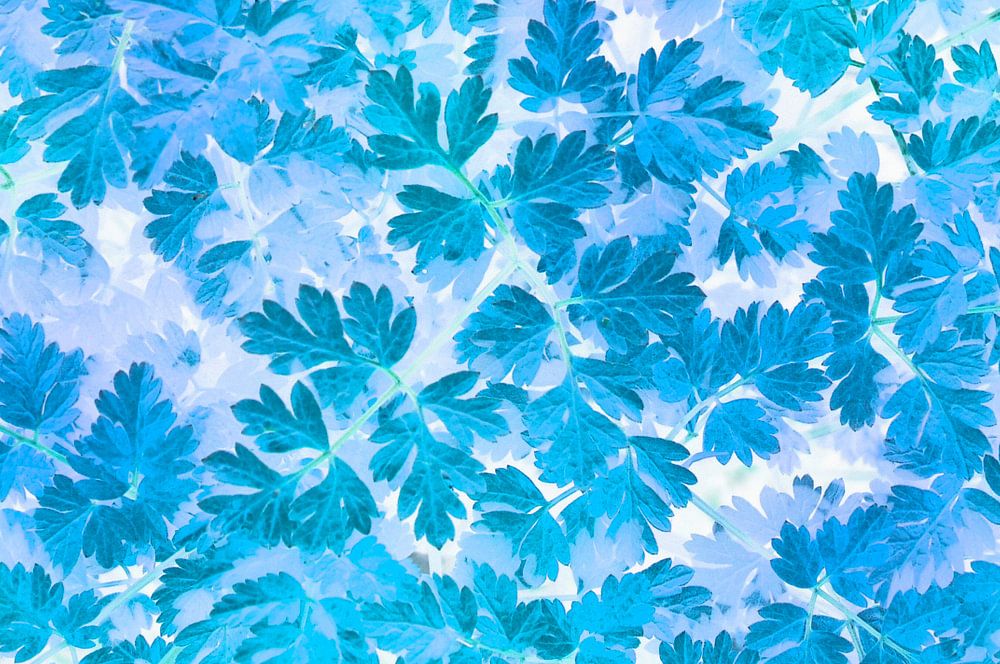 Buy this flower art Blue leaves by Corinne Welp on canvas, ArtFrame, poster and wallpaper, printed on demand in high quality.