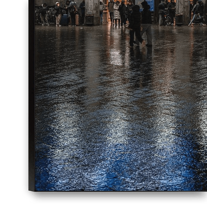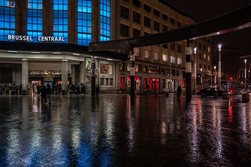 In the evening rain, the Europa intersection at Brussels-Central takes on an almost cinematic atmosphere. The wet road surface turns into a mirror in which light and movement converge. Pedestrians with umbrellas cross over, anonymous yet recognisable, while the station is bathed in a cool blue glow. The city seems to slow down for a…