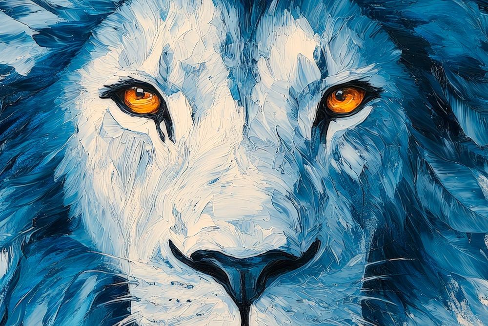 A powerful lion with bright orange eyes and a majestic mane attracts everyone's attention. The dynamic blue tones lend the picture a calming yet haunting presence. Perfect for the living room, it radiates both strength and elegance and makes a striking accent on the wall.