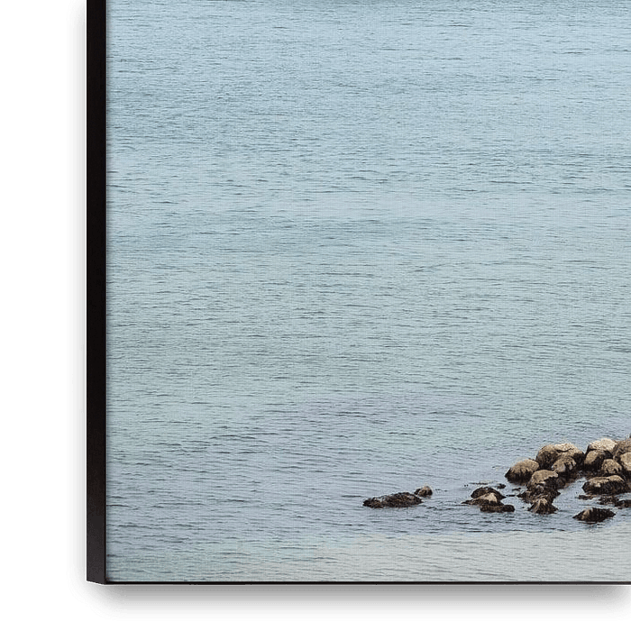 Photo printing of the Danish coast, blue green sea water glistens in the sun. Beautiful stacked stones for your meditation space.