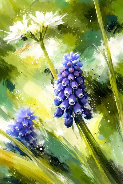 A vibrant depiction of blooming blue grape hyacinths surrounded by lush green foliage. The coarse brushstrokes add a dynamic texture to the composition.