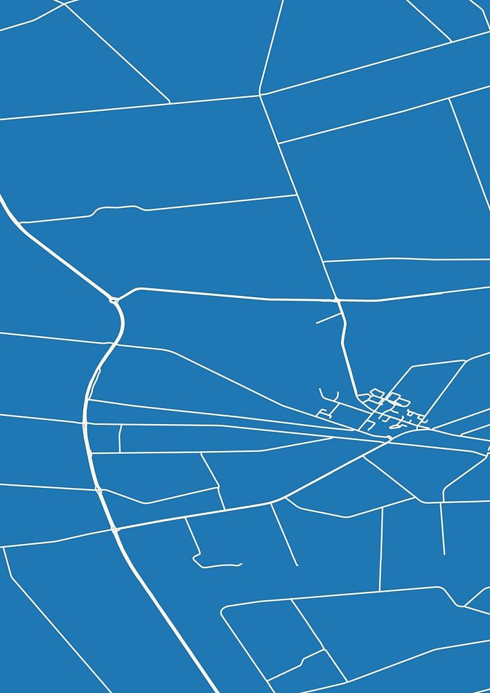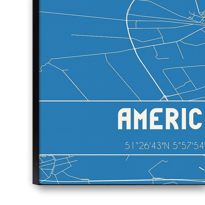 Blueprint of the map / map of the Dutch town of America, located in municipality of Horst aan de Maas, province of Limburg. The map includes all public roads and the coordinates of the center of America.