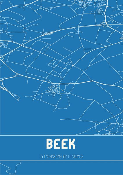 Blueprint of the map / map of the Dutch town of Beek, located in the Liemers, in municipality Montferland, province of Gelderland. The map includes all public roads and the coordinates of the center of Beek.