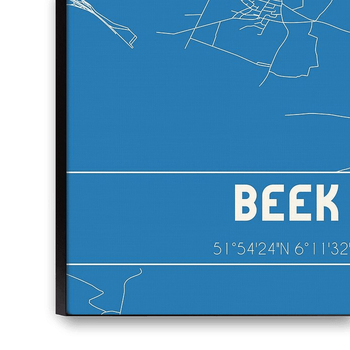 Blueprint of the map / map of the Dutch town of Beek, located in the Liemers, in municipality Montferland, province of Gelderland. The map includes all public roads and the coordinates of the center of Beek.
