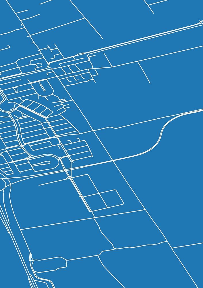 Blueprint of the map / map of the Dutch town Delfgauw, located in municipality Pijnacker-Nootdorp, province of South Holland. The map contains all public roads and the coordinates of the center of Delfgauw.