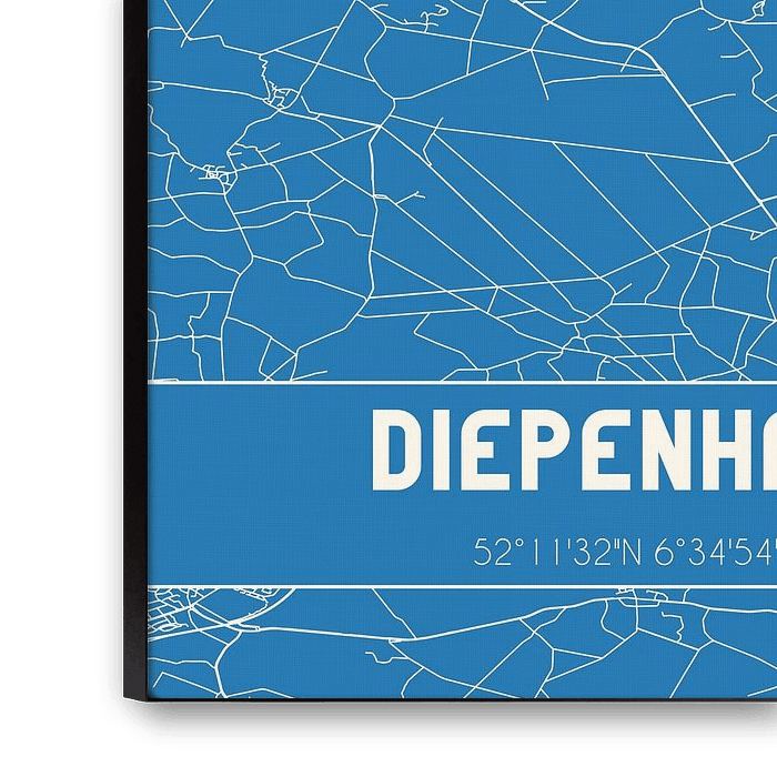 Blueprint of the map / map of the Dutch town Diepenheim, located in Twente, in municipality of Hof van Twente, province of Overijssel. The map contains all public roads and the coordinates of the center of Diepenheim.