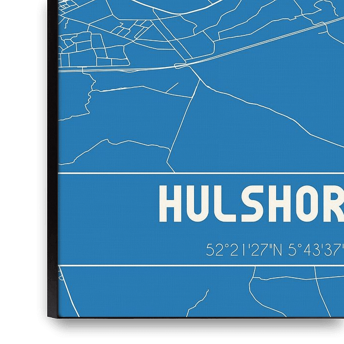 Blueprint of the map / map of the Dutch town of Hulshorst, located in the Veluwe, in municipality Nunspeet, province of Gelderland. The map includes all public roads and the coordinates of the center of Hulshorst.