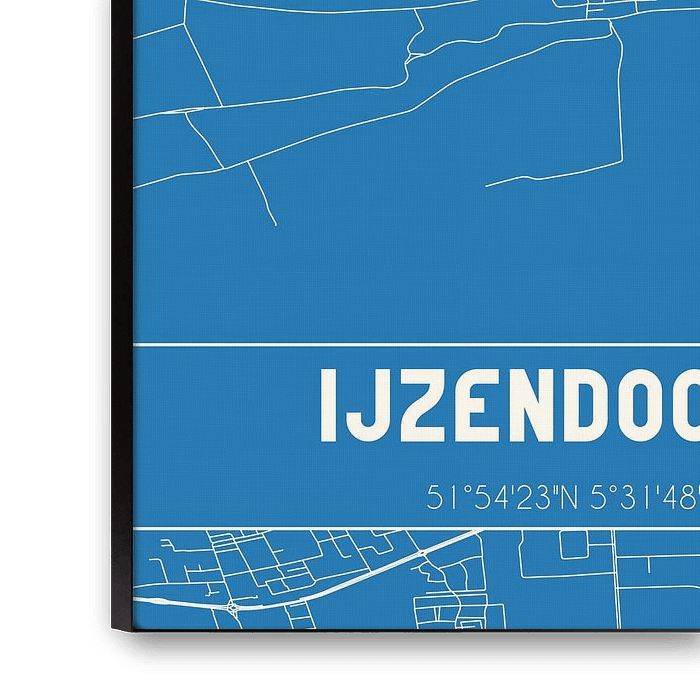 Blueprint of the map / map of the Dutch town IJzendoorn, located in the Betuwe, in municipality Neder-Betuwe, province of Gelderland. The map contains all public roads and the coordinates of the center of IJzendoorn.