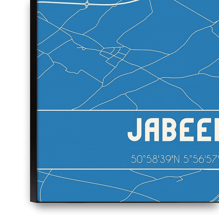 Blueprint of the map / map of the Dutch town of Jabeek, located in municipality of Beekdaelen, province of Limburg. The map contains all public roads and the coordinates of the center of Jabeek.