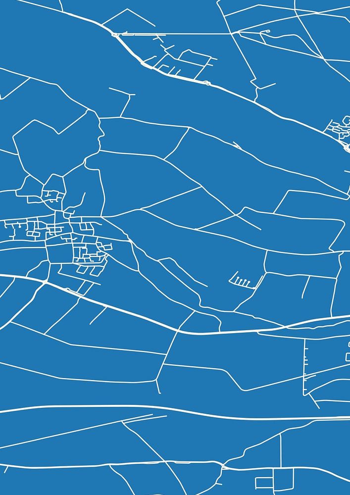 Blueprint of the map / map of the Dutch town of Lienden, located in the Betuwe, in municipality of Buren, province of Gelderland. The map includes all public roads and the coordinates of the center of Lienden.