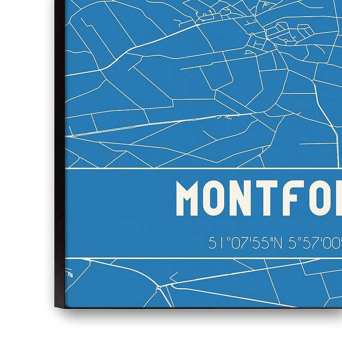 Blueprint of the map / map of the Dutch town Montfort, located in municipality of Roerdalen, province of Limburg. The map contains all public roads and the coordinates of the center of Montfort.