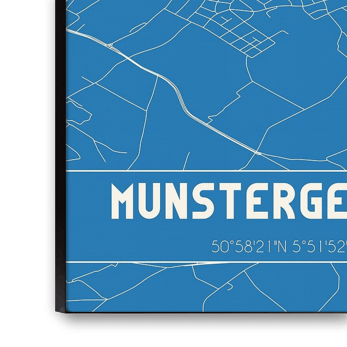 Blueprint of the map / map of the Dutch town Munstergeleen, located in municipality Sittard-Geleen, province of Limburg. The map contains all public roads and the coordinates of the center of Munstergeleen.