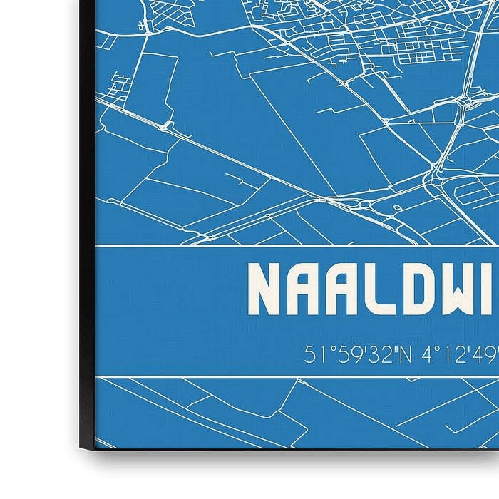 Blueprint of the map / map of the Dutch town of Naaldwijk, located in municipality of Westland, province of South Holland. The map includes all public roads and the coordinates of the center of Naaldwijk.