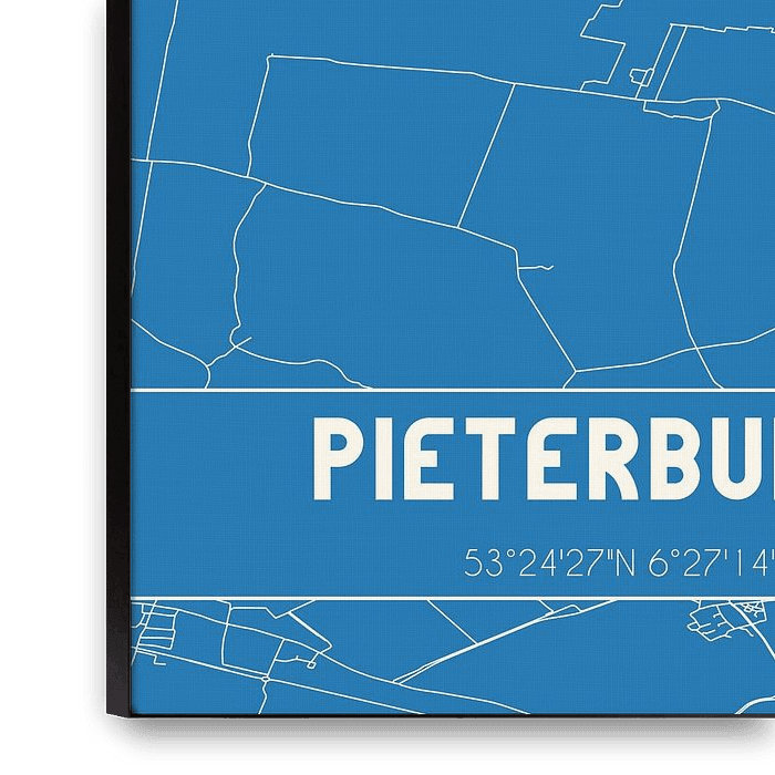 Blueprint of the map / map of the Dutch town of Pieterburen, located in municipality Het Hogeland, province of Groningen. The map includes all public roads and the coordinates of the center of Pieterburen.