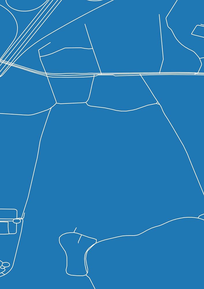 Blueprint of the map / map of the Dutch town Ressen, located in the Betuwe, in municipality Lingewaard, province of Gelderland. The map includes all public roads and the coordinates of the center of Ressen.