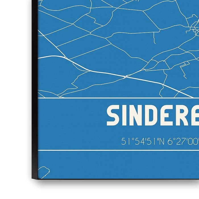 Blueprint of the map / map of the Dutch town of Sinderen, located in the Liemers, in municipality Oude IJsselstreek, province of Gelderland. The map contains all public roads and the coordinates of the center of Sinderen.