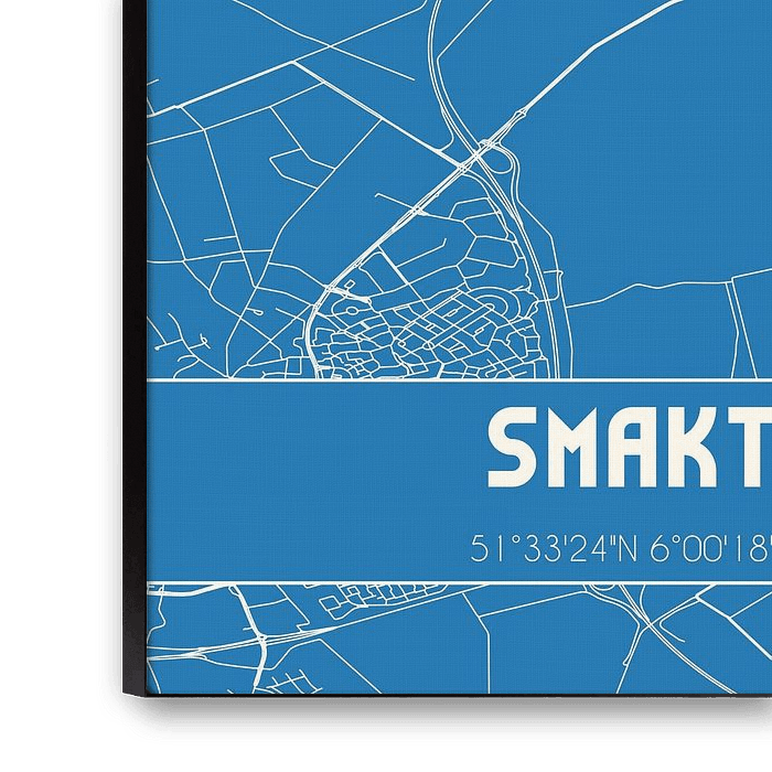 Blueprint of the map / map of the Dutch town of Smakt, located in municipality of Venray, province of Limburg. The map contains all public roads and the coordinates of the center of Smakt.
